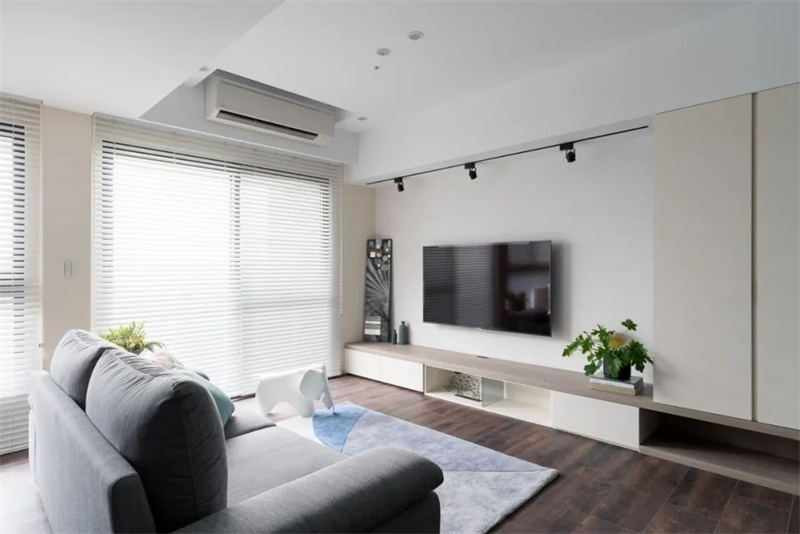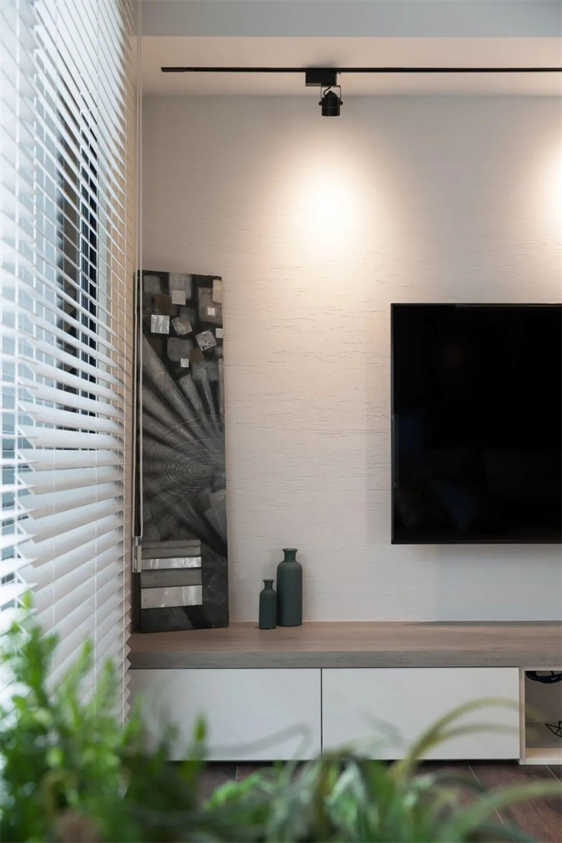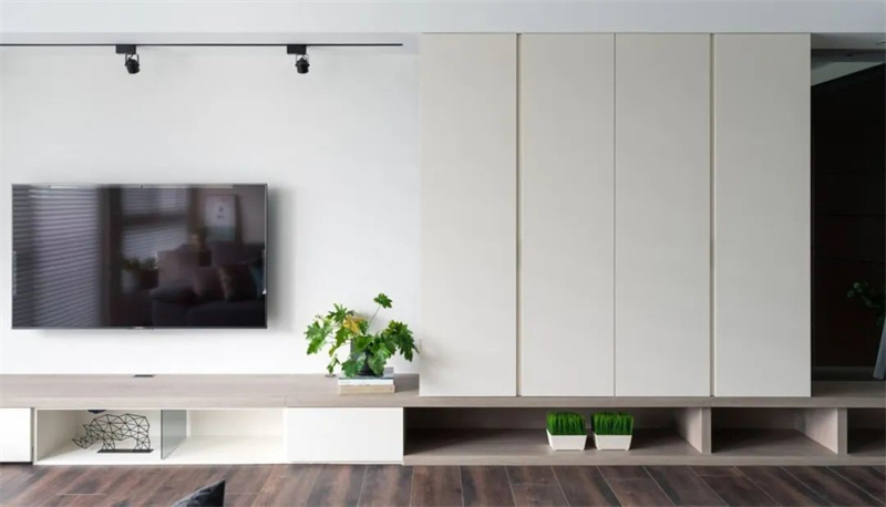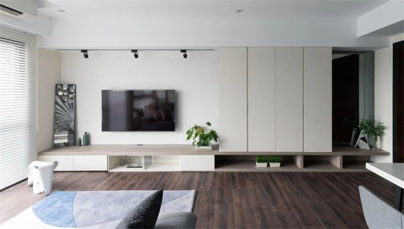客厅以白色和浅木色为主色调,搭配深色木地板,展现出一种清新自然的北欧风情。大面积的白色墙面和天花板使整个空间显得更加明亮开阔,悬挂在墙上的电视机成为视觉焦点,下方的木质电视柜设计简洁大方,既实用又美观,绿植点缀其间,增添了几分艺术气息和生机活力。