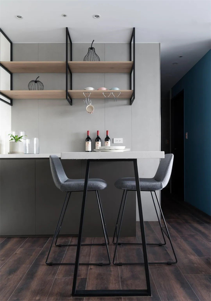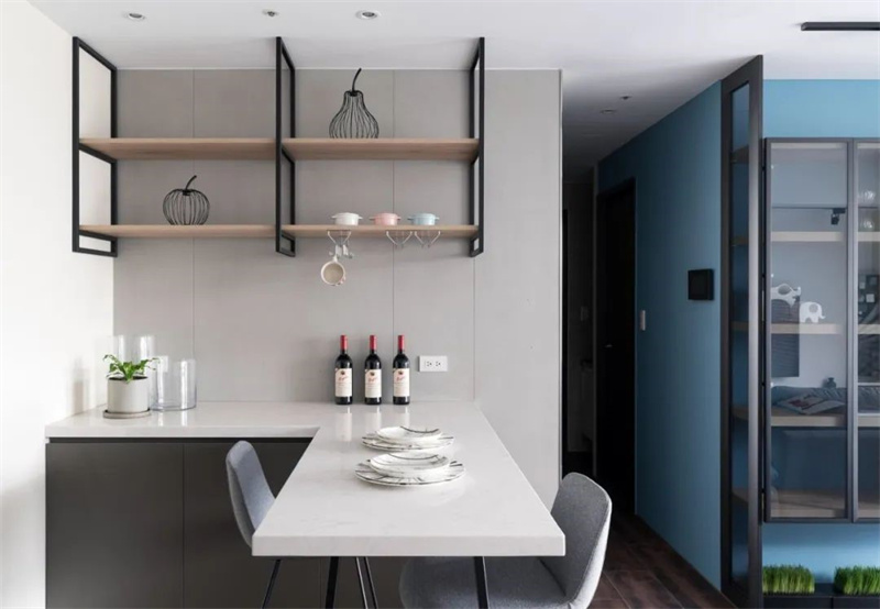 餐厅采用简洁大方的白色大理石餐桌,搭配灰色布艺餐椅,整体色调和谐统一,带来极致的用餐体验。餐桌上方的开放式木质搁架设计简约实用,不仅提供了充足的储物空间,还成为展示个性和收藏爱好的小天地。桌面上整齐摆放的餐具和酒品,彰显了主人对生活的精致追求。