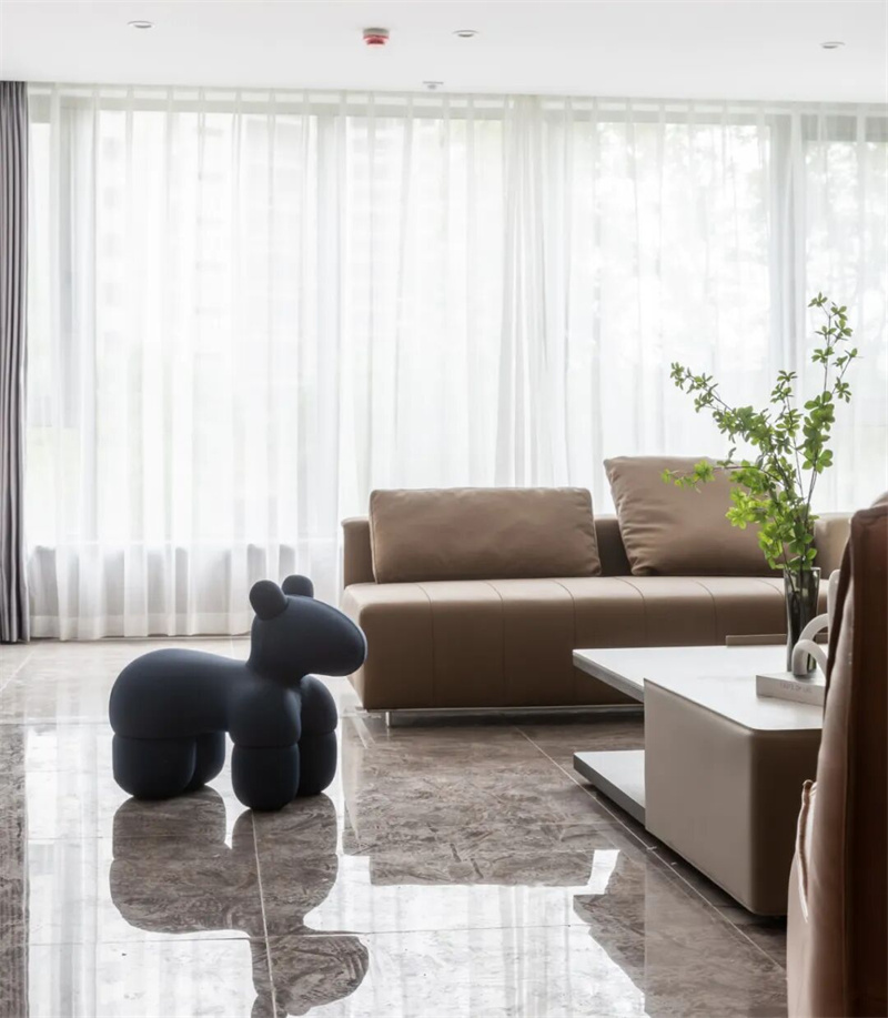 客厅拥有优秀的采光条件,设计师选择轻薄的窗帘布料,以确保阳光可以自由地洒进室内,最大限度地引入自然光线。这样的设计不仅增加了室内的明亮度,还让客厅与室外景色相融合,营造出一种开放和通透的感觉。