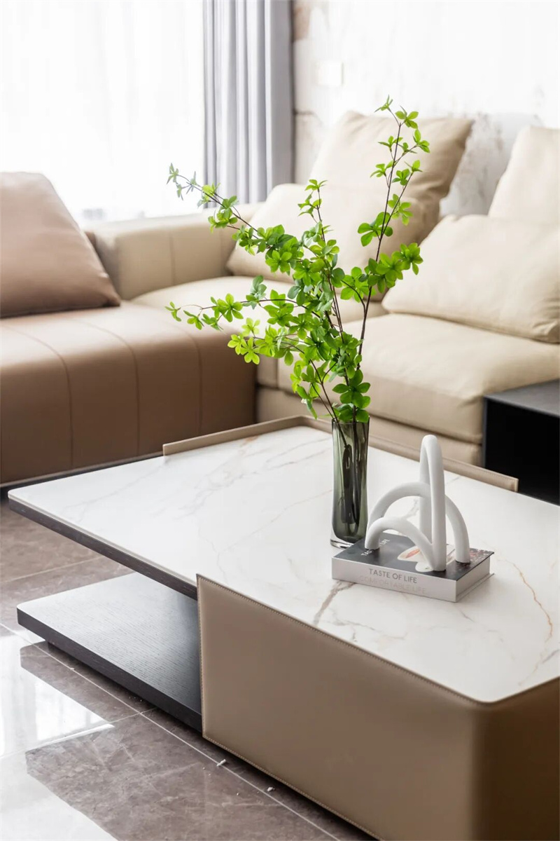 客厅的布局注重简洁和流畅性,强调空间的整洁和无冗余的设计。一张舒适的糯白色沙发,搭配白色顶面和咖啡色墙面,营造一个明亮而温馨的空间。采用一些色彩明亮的软装和艺术品来装饰,使整个空间更加生动有趣。