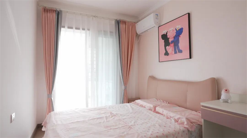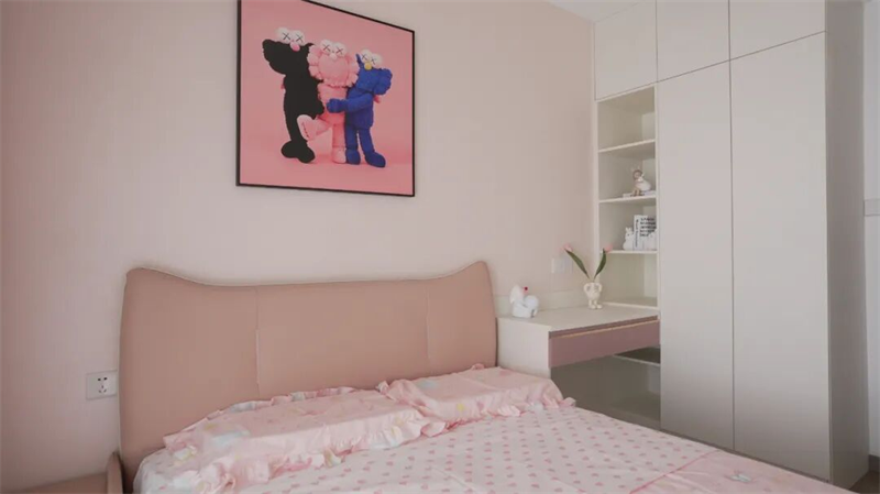 儿童房以柔和的粉色为主调,营造温馨可爱的氛围。床头软包与床品呼应,搭配卡通图案,充满童趣。墙上挂有时尚艺术画作,增添个性与趣味。右侧定制衣柜与书桌一体设计,收纳与学习功能兼备,简洁实用。窗帘采用粉灰拼色,透光柔和,整体空间既梦幻又不失现代感,是孩子成长的理想小天地。