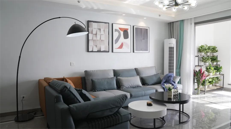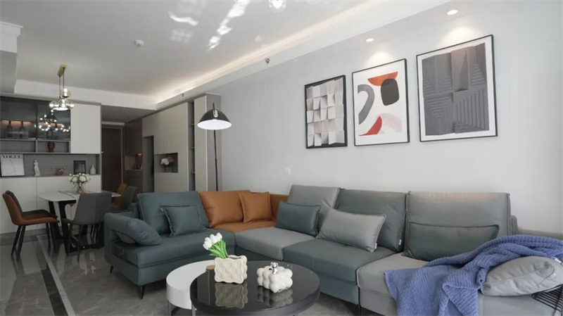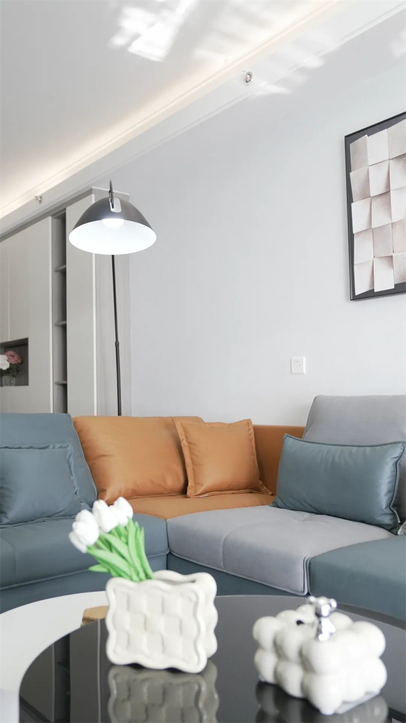 客厅L型布艺沙发选用蓝灰与橙色拼接配色,既提升视觉活力,又带来柔软舒适的坐感体验。中央圆形茶几组合简洁实用,黑白搭配呼应整体色调。墙上三幅抽象艺术挂画点缀墙面,增添艺术气息。一盏黑色弧形落地灯不仅提供局部照明,更成为空间中的点睛之笔。