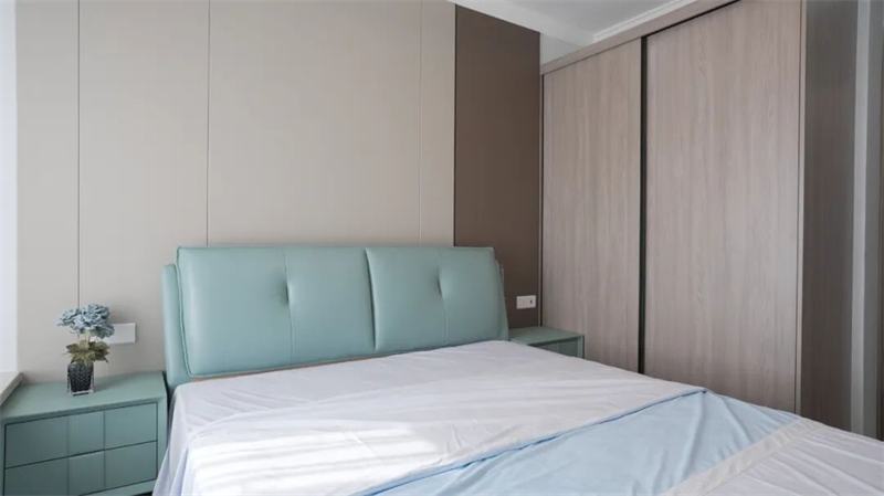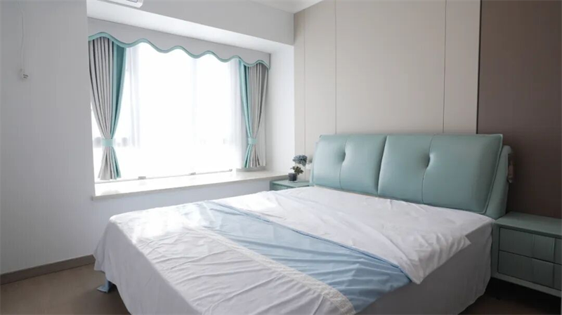 主卧以柔和色调营造宁静舒适的睡眠空间,浅灰与木色背景墙搭配湖绿色软包床头,清新雅致。同色系床头柜与衣柜设计协调统一,简洁实用。大窗配浅色纱帘与波浪边窗帘,采光充足又不失温馨。整体布局清爽有序,让卧室成为放松身心的理想休憩之所。