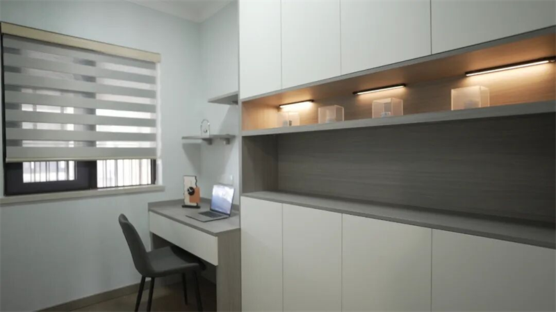 书房以简洁实用为主,浅蓝墙面搭配木纹与白色柜体,营造安静专注的氛围。一张简约书桌,搭配舒适座椅,光线充足,适合阅读与办公。上方定制储物柜结合开放格与隐藏灯带,既提升收纳能力,又增添空间层次感。