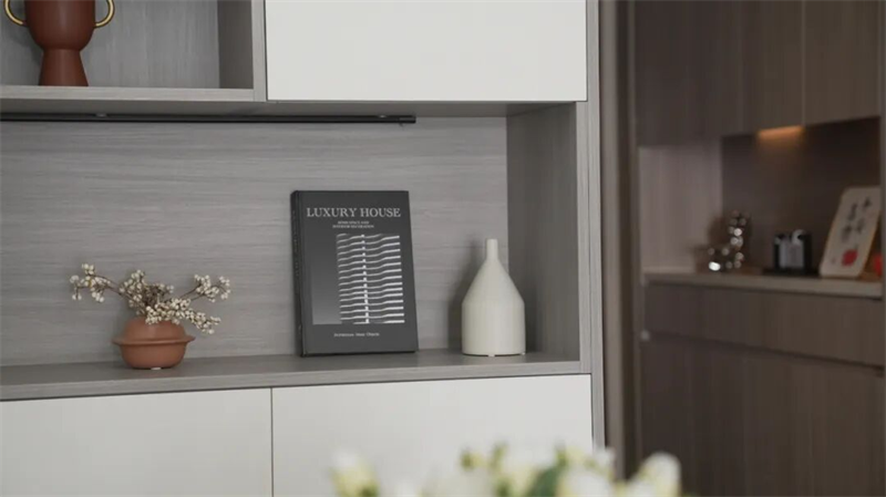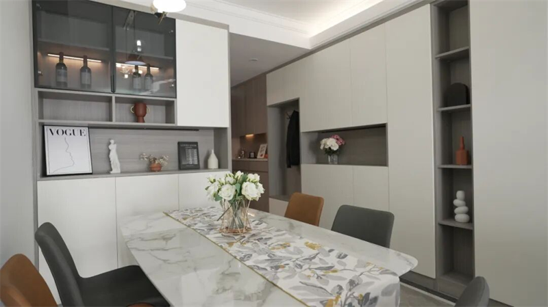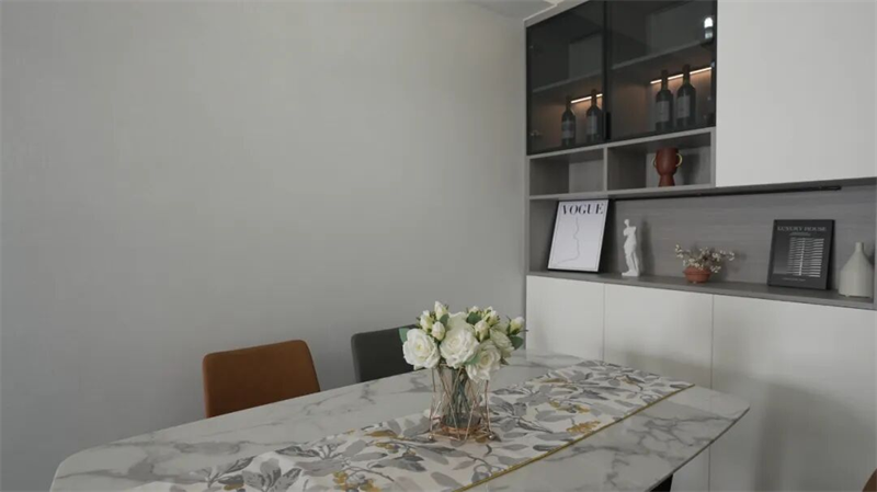 餐厅以现代简约风格打造,浅灰色墙面与大理石餐桌相得益彰,搭配不同色调的皮质餐椅,简洁又富有层次。餐边柜采用玻璃门与开放格设计,内置灯带,兼具收纳与展示功能。一束鲜花点缀桌面,增添生活气息。空间与客厅自然连通,动线流畅,营造出温馨舒适的用餐氛