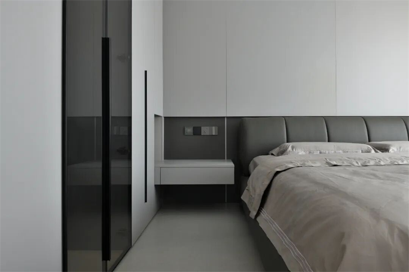 主卧床头背景墙采用整面定制护墙板设计,软包床头靠背舒适贴合,搭配浅灰色床品,低调中透出高级质感。两侧悬空床头柜设计轻盈实用,内置隐藏式灯带,提供柔和夜光照明,兼顾美观与功能性。大窗户配白色纱帘与深色遮光帘,自然光可自由调节,保证私密性的同时引入柔和光线。顶部无主灯设计,结合线性灯带与筒灯,营造层次分明的灯光氛围。